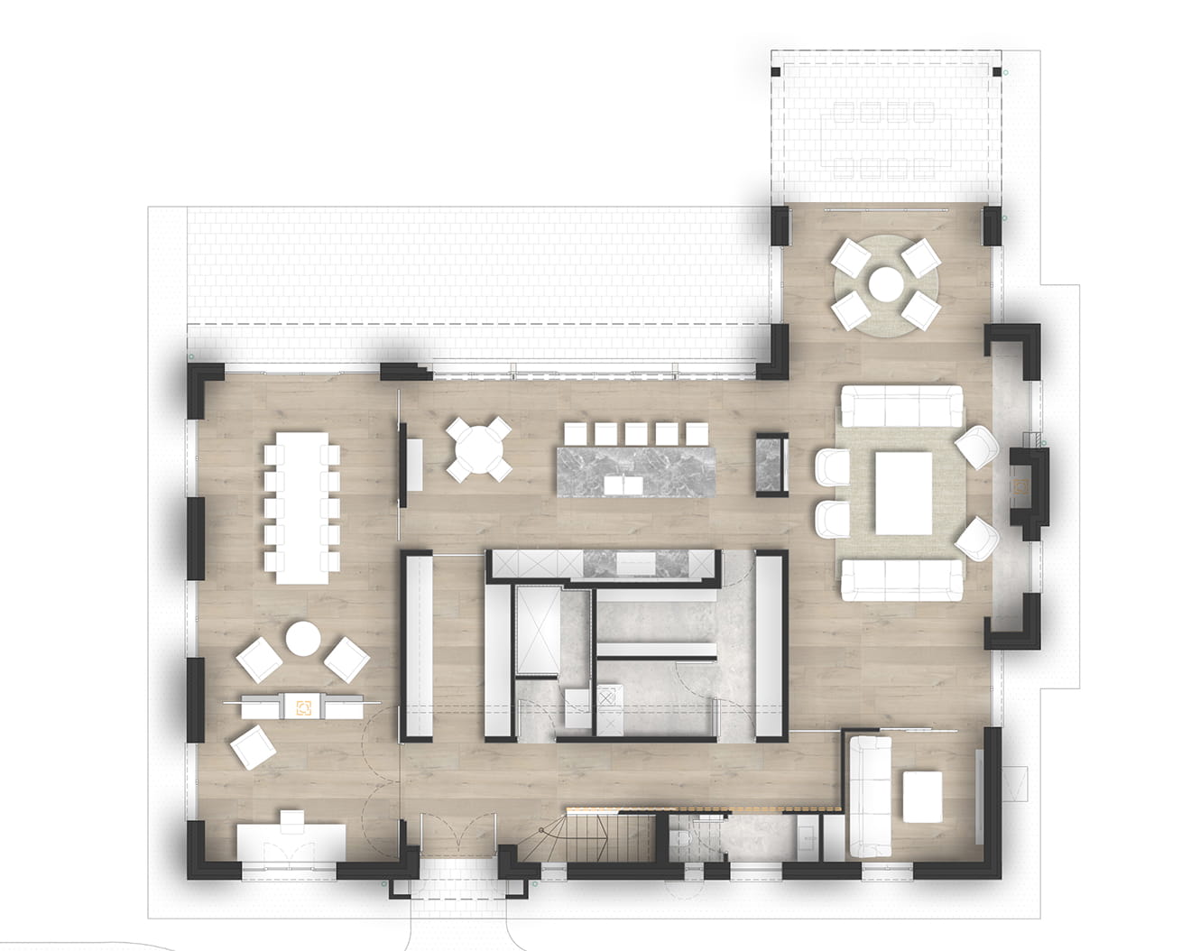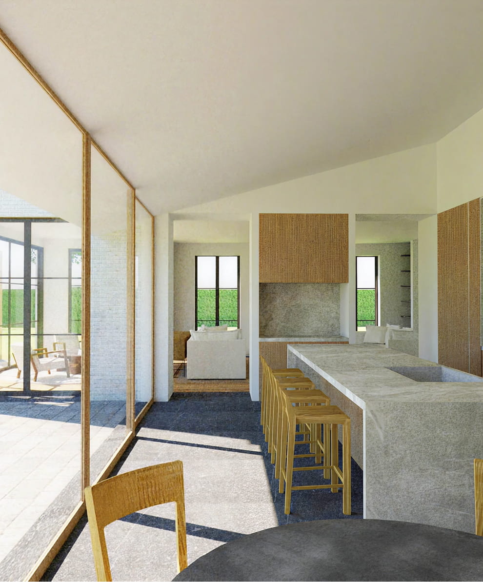 De renovatie vertrok vanuit drie grote principes: 1. Respect voor de oorspronkelijke architectuur | 2. Een nieuwe, logische indeling voor een gezin | 3. Een sterke relatie tussen binnen en buiten. De achtergevel werd het belangrijkste element: grote open leefruimte met keuken, grote raampartijen en schuiframen naar terras en tuin.